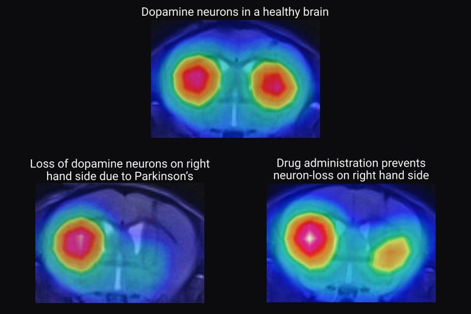 Brain scans show a loss of dopamine-containing neurons in the brain caused by Parkinson’s disease, but these signals improved with the drug.